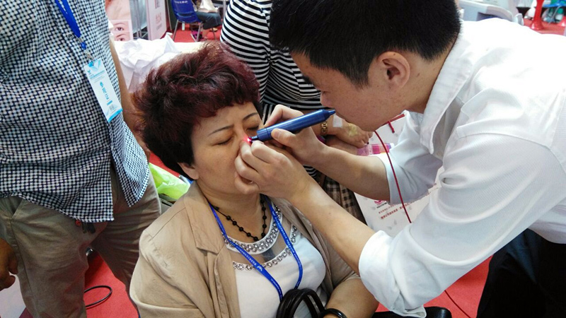 美容导师正在给顾客体验澳玛新推出的雷霆净丝仪,激光去红血丝,立马见效果!