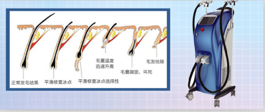 激光机发射的光束会穿透皮肤表层最终被毛囊吸收,通过对激光能量的有选择吸收,使毛囊受到破坏,不能再生长毛发,同时又不损伤周边组织。OPT冰点脱毛的过程简单、快捷,治疗后一般不留疤痕。