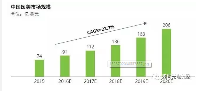 按照研究发布数据,中国医疗美容市场2018年全年预计达到136亿美元,年均复合增长率达到22.7%。以激光类医美在全球医美市场份额占19.78%计算,2018年中国医美市场非手术光电类项目规模预计达到27亿美元,约合175亿元人民币。