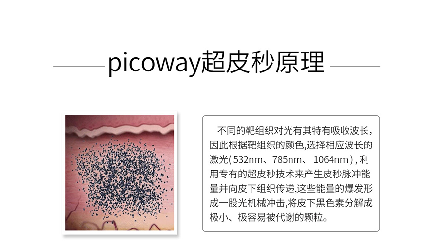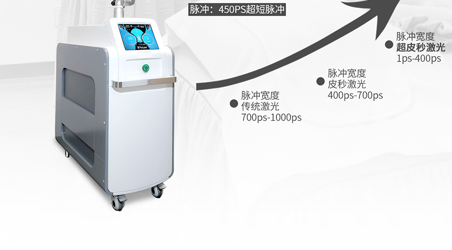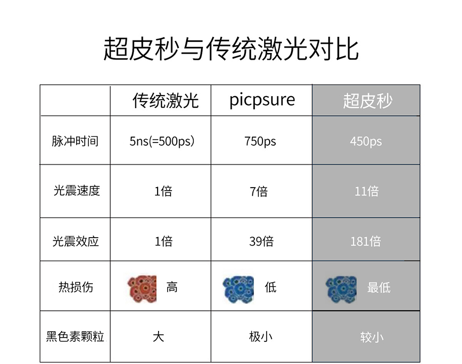 采用450PS超短脉冲,光震效果是Picpsure的4.6倍,光震效果越强,击碎黑色素颗粒分解产生颗粒越小,同时减少热损伤,消除反黑担忧。