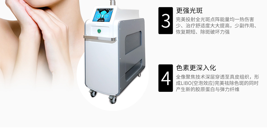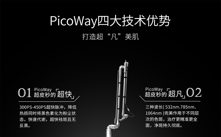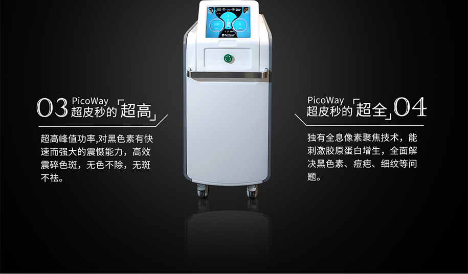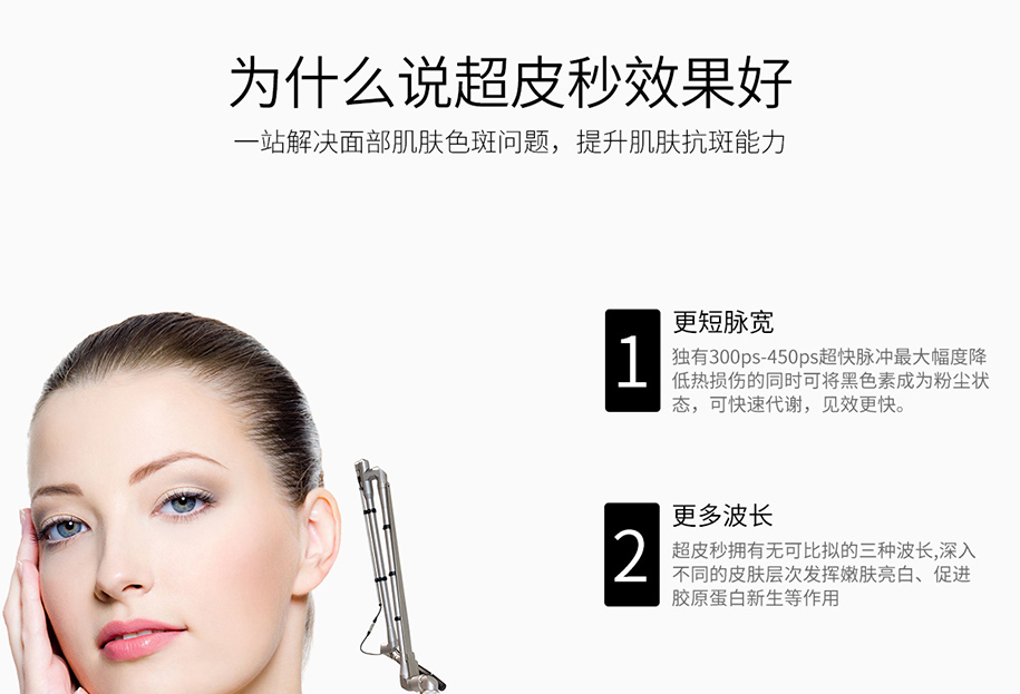 最新顶级激光仪器超皮秒,运用全息像素聚焦技术,拥有比蜂巢皮秒更快速强大的能量直接震碎黑色素,将黑色素破坏得比皮秒更小的粉尘状,更易于人体自身代谢,通过多维度治疗,达到祛除色素、美白嫩肤等效果。