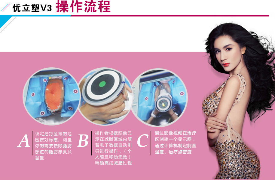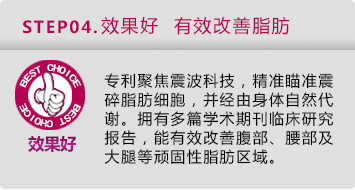 | 非侵入式的直接从体外震碎脂肪细胞,安全地将你身上特定部位的脂肪溶解。 |