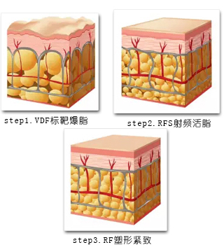 | 以动力聚焦超音波探头VDF破坏脂肪细胞,再以真空电波拉皮探头RF-Vac紧实肌肤并同时促进淋巴循环,改善橘皮组织等问题。 |