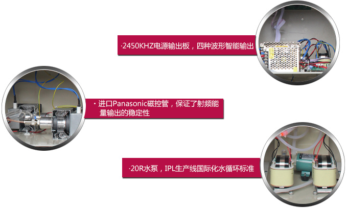 1、进口Panasonic磁控管,保证了射频能量输出的稳定性 2、水泵采用磁力循环泵,避免了国产自吸泵的故障隐患 3、采用300W美国AE射频电源 4、2450KHZ电源输出板,四种波形智能输出 5、绝缘体高密度陶瓷头,保证其操作安全性和舒适度 6、模块指令中央处理分析调配系统 |